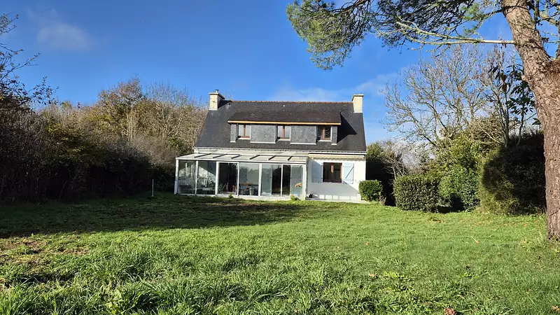 Située au calme, dans un bel environnement proche du Belon et des sentiers de randonnée, agréable et lumineuse maison rénovée des années 80 sise sur un terrain de 1500 m2 constructible, comprenant : entrée, salon-séjour avec pôêle à bois, cuisine équipée ouverte, véranda, chambre, salle de douche , WC.
