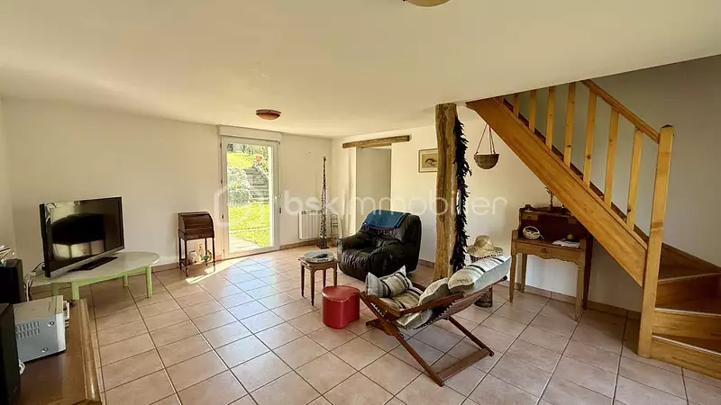 Le rez-de-chaussée comprend une cuisine ouverte sur une salle à manger chaleureuse grâce à son poêle à bois et ses poutres apparentes, un salon lumineux d'environ 25 m2, une salle de bains avec baignoire et douche, un WC séparé, ainsi qu'un atelier, parfait pour stocker.
