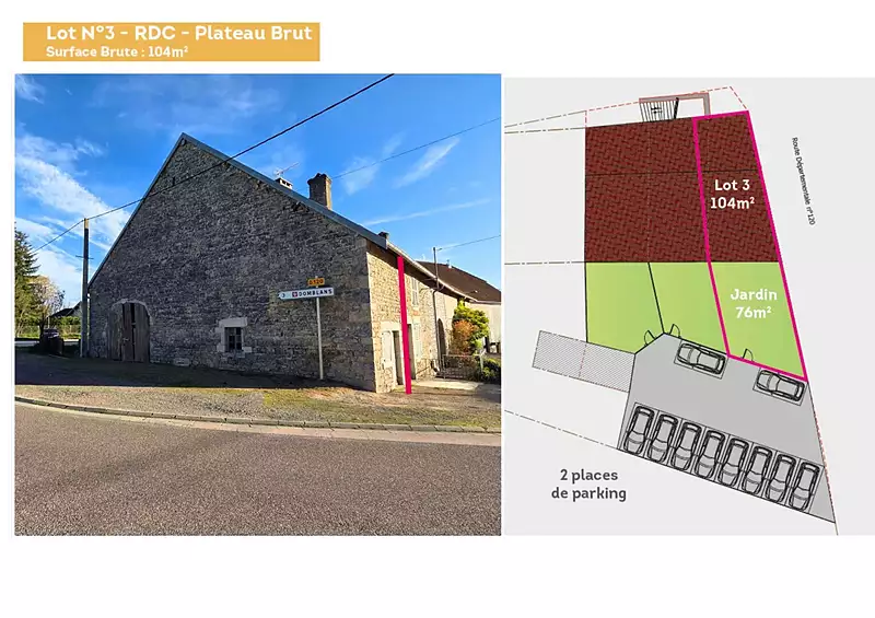 NOUVEAUTÉ et EXCLUSIVITÉ Stéphane PLAZA Immobilier Lons-le-Saunier Un projet de rénovation global à fort potentiel vous attend au coeur du charmant village de Saint-Germain-lès-Arlay (39210), à seulement 10 minutes de Lons-le-Saunier et Bletterans, et à moins de 5 km de l'autoroute A39. Les points forts à ne pas manquer : Façades fraîchement rénovées, alliant caractère et pérennité. Viabilisations neuves : eau, électricité et assainissement déjà en place ! Extérieurs soignés : cour aménagée, pelouse fraîchement semée, 2 places de stationnement privatives, box cave, 2 places de stationnement collectif pour visiteurs. Ce plateau brut offre 59 m² au sol, avec la possibilité d'aménager jusqu'à 3 niveaux pour atteindre plus de 150 m² habitables selon vos envies. Un jardin privatif de 76 m² vient compléter ce bien, idéal pour profiter d'un extérieur agréable dans un cadre paisible. Un plan d'aménagement est proposé (153,7 m² habitables sur 3 niveaux), mais vous êtes totalement libre de concevoir votre intérieur selon vos goûts et vos besoins. Compteurs d'eau et d'électricité individuels : un vrai plus pour un projet sur mesure. Ce bien est parfait pour une résidence principale, un investissement locatif ou un projet saisonnier. Une fois rénové, vous profiterez du confort du neuf dans le charme d'une ancienne ferme en pierre, sur le secteur recherché du nord de Lons-le-Saunier Pour plus de renseignements concernant ce bien, contactez Stéphanie LORTON, 06.81.30.02.58 , agent immobilier SIREN 532 089 430, membre du réseau Stéphane Plaza Immobilier. Mandat exclusif 200688 - 55 000 euros dont 5 000 euros d'honoraires forfaitaires à la charge du vendeur. Retrouvez ce bien sur notre site pour plus d'infos Les informations sur les risques auxquels ce bien est exposé sont disponibles sur le site Géorisques www.georisques.gouv.fr Commerçant indépendant membre du réseau Stéphane Plaza Immobilier. Copropriété de 4 lots ().