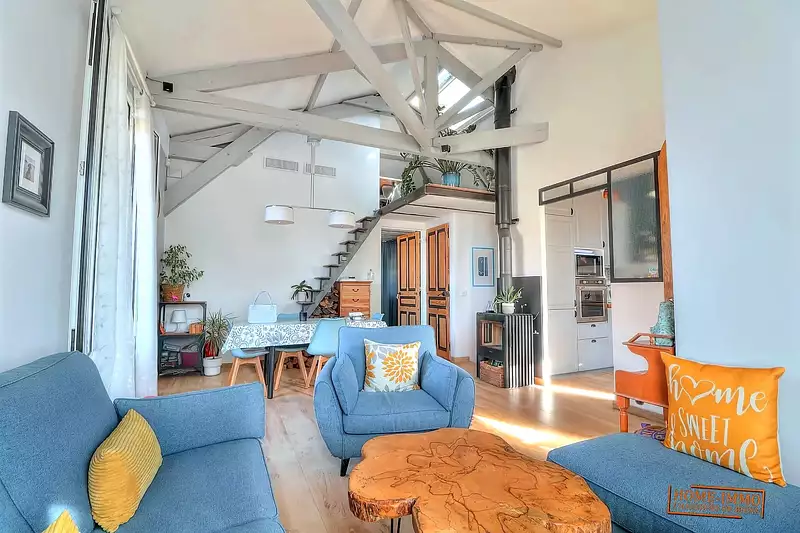 À l’étage : vaste séjour avec cuisine équipée, suite parentale, WC indépendant et mezzanine de 12 m².