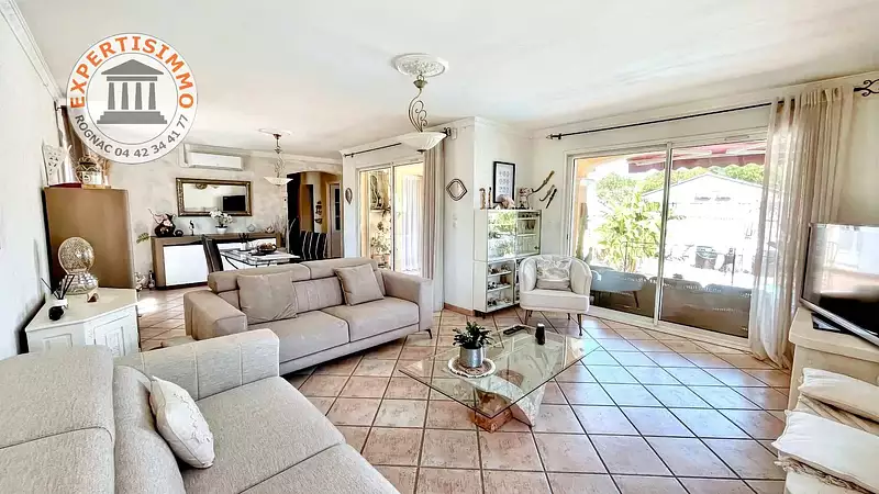 Le séjour d’environ 36 m², lumineux et traversant, bénéficie de moulures au plafond, d’un split de climatisation réversible, et de grandes baies vitrées ouvrant sur une vaste terrasse exposée sud. Cet espace de vie se prolonge harmonieusement vers l’extérieur, idéal pour les beaux jours.