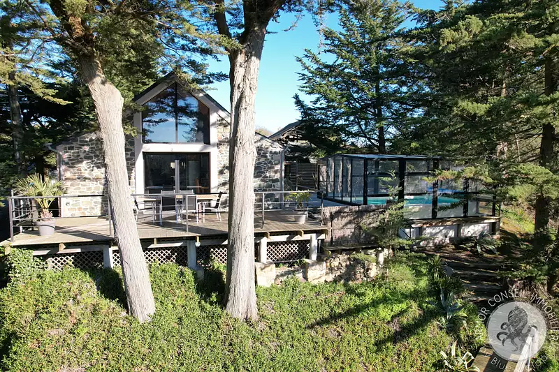 A l'extérieur, se trouve une piscine à débordement chauffée donnant sur deux grandes terrasses joliment arborées.