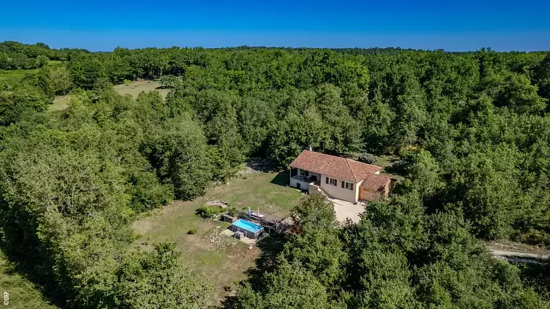 Secteur GOURDON - Proche d'un village avec tous commerces, au calme sans voisins proches sur 1ha10 boisés avec jolie vue campagne, un chemin privé amène à cette agréable et lumineuse Maison Contemporaine de plain-pied - 105 m² habitables dont séjour avec cuisine de 50 m² et 3 chambres. Terrasse couverte, garage/atelier attenant.