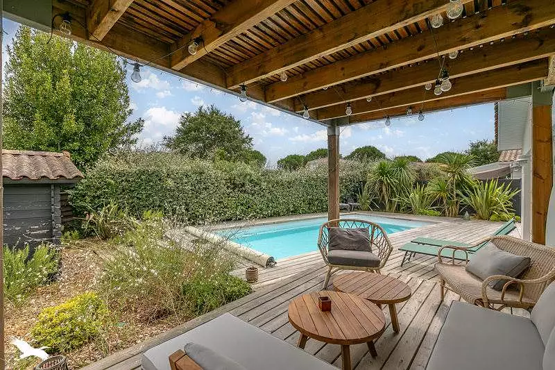 Dans le quartier recherché des musiciens à Gujan Mestras, maison de plain-pied de près de 105 m² habitable, composée d'une cuisine américaine équipée, d'un séjour donnant sur la terrasse et la piscine, 4 chambres, salle de bain et wc. Le tout sur un terrain clos et paysagé à quelques pas des commerces. Proposition d'aménagement virtuel non contractuelle en dernière photo.
