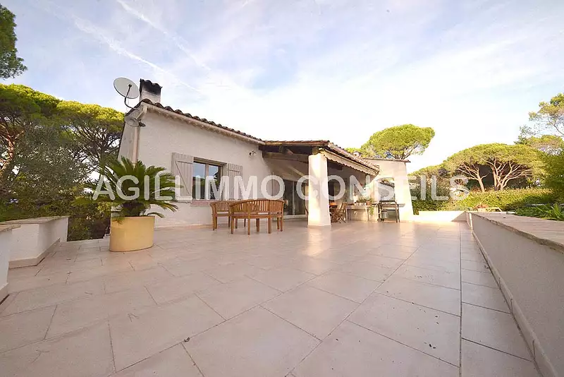 Entrée avec dressing (possibilité bureau), un beau séjour (40m² env) avec baie vitrée coulissante donnant sur une terrasse couverte, une cuisine séparée aménagée et équipée, 2 chambres dont une avec son dressing, une salle d’eau avec douche à l’italienne (travertin), WC séparés avec lave mains et fenêtre. Une piscine avec traitement au sel et un grand garage avec mezzanine viennent compléter cette belle maison. Climatisation – Portail électrique avec digicode – garage électrique – Fenêtres bois double vitrage sauf dans la cuisine et la baie vitrée du séjour sont PVC double vitrage – adoucisseur d’eau – chauffe-eau thermodynamique Maison ayant été rénovée avec goût ! Rare, à visiter rapidement !