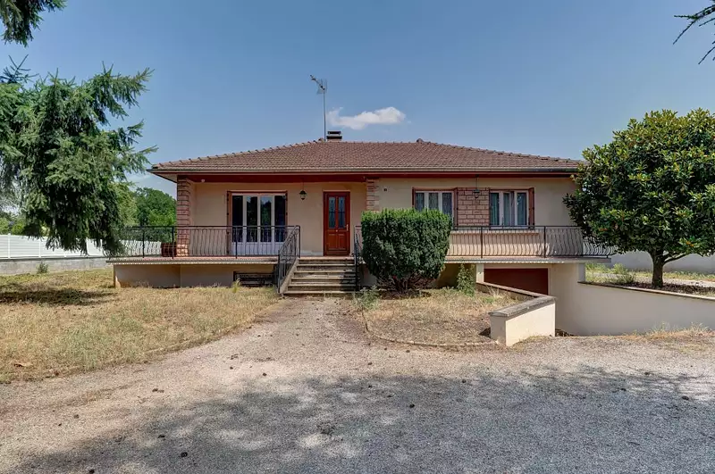 Pusignan centre, dans secteur résidentiel, sur une parcelle de 1280m², maison individuelle de 102 M2 bénéficiant de quatre expositions: au Rdc surélevé : cuisine indépendante équipée, séjour salon parquet de 30M2, 3 chambres, WC, salle de bains, nombreux rangements, combles perdus au dessus..Au sous-sol semi enterré : garage, buanderie et atelier, chaufferie central au fuel...maison reliée au tout à l'égout, double vitrage 2022 et isolation des combles 2020.
