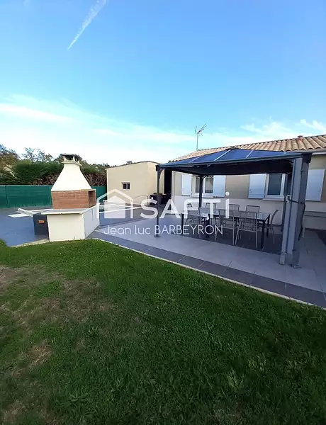 À l'extérieur, cette propriété comprend un vaste terrain de 908 m² entièrement clôturé, agrémenté d'une piscine, d'une terrasse et d'un jardin. Un hangar spacieux pouvant accueillir 4 voitures, ainsi qu'un garage, offrent un espace de stationnement couvert et sécurisé, idéal pour les familles ou les amateurs de bricolage.