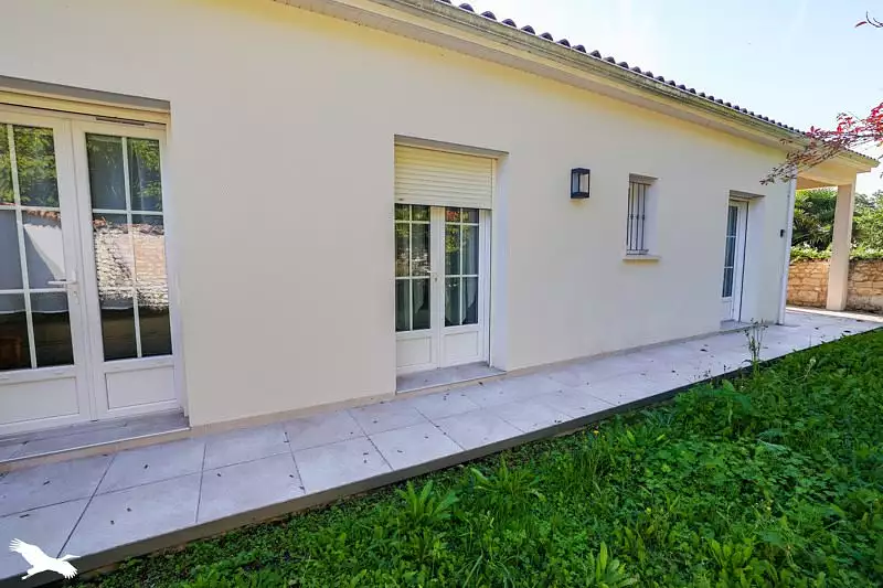 Maison contemporaine avec vie de plain-pied, chauffage au sol. Cuisine ouverte sur un séjour lumineux, un WC, trois chambres et d'une salle d'eau. Une terrasse couverte et un garage non attenant, le tout sur un terrain arboré d'environ 857 m². Commerce à pied.