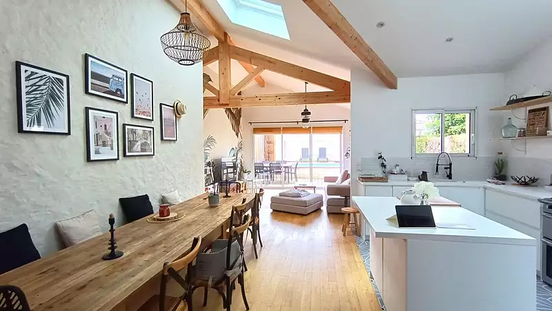 Sa réhabilitation complète de qualité a été terminée en 2021 par un professionnel, avec toutes les assurances nécessaires. Elle est exposée à l'ouest, ce qui la rend très lumineuse. La maison dispose d'un système de chauffage gainable réversible avec une pompe à chaleur air/air, une charpente apparente et une belle hauteur sous plafond de 3,85m. Les volets roulants électriques Somfy sont équipés de la domotique, avec une application pour les contrôler à distance.