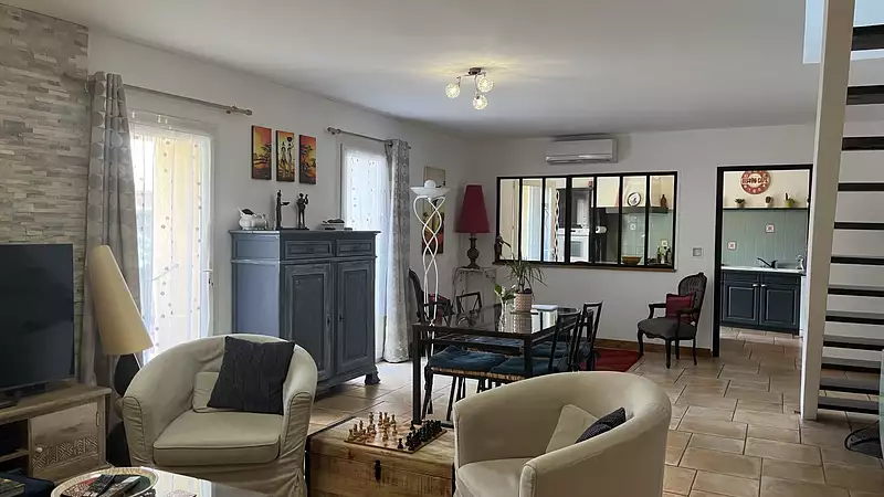 La maison dispose d'un beau salon - salle à manger équipé d'un poêle à granules et dans le prolongement une belle cuisine avec terrasse.