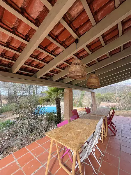 Au rez-de-chaussée, vous trouverez un séjour exposé sud, une cuisine indépendante donnant accès à une terrasse couverte et à la piscine, deux chambres, une salle de bain et un WC séparé.