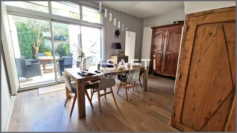 Dès l'entrée, vous serez séduit par le séjour chaleureux s'ouvrant sur une large baie vitrée à galandage laissant apparaître le patio extérieur. En traversant le séjour, pourvu d'une belle cheminée en pierre, vous découvrirez la cuisine équipée et fonctionnelle.