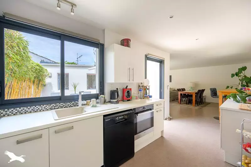 PORT NUF, à quelques pas du stade et des commerces, contemporaine de 2012 avec garage de PLAIN-PIED. Le jardin d'accueil ouvre sur la pièce à vivre de 50m2 exposée S/O et sa cuisine ouverte, accès sur la terrasse sans vis à vis. La partie nuit est composée de 3 chambres au calme, 1 salle d'eau sur le second patio et 1WC.