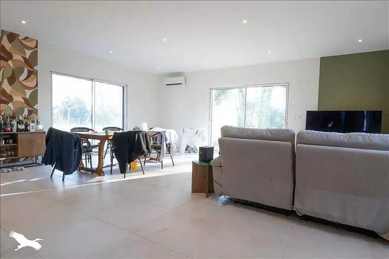 Entre commerces et plages, Villa de 2024 offrant de plain-pied un vaste et lumineux séjour avec triple exposition et cuisine américaine équipée avec îlot central, 3 chambres avec placard, salle d'eau, 2 wc, garage, l'ensemble sur un terrain clos et arboré d'environ 600m² Proposition d'aménagement virtuel non contractuelle en dernière photo.