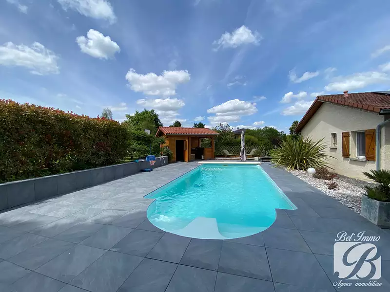 Elle est agrémentée d'un extérieur soigneusement entretenu, d'une terrasse ensoleillée, d'une belle piscine avec son pool-house et son coin bar.