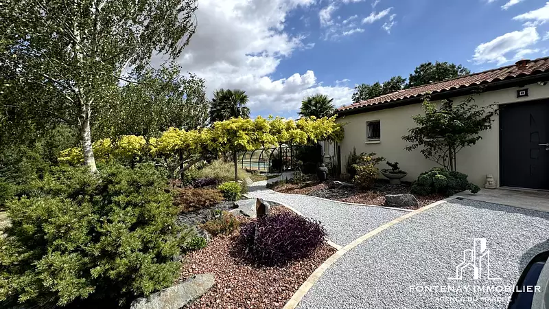 À l'extérieur, le terrain arboré de 3 852 m² est agrémenté d'une piscine couverte de 10 x 5 m et traversé par un petit ruisseau, apportant charme et fraîcheur à la propriété.