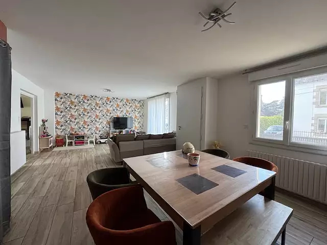 Pontivy proche des commodités, coup de coeur assuré pour cette maison de 107m2 rénovée de 1979 mitoyenne avec un terrain clos de 702 m2 comprenant au RDC : une grande pièce de vie, une cuisine aménagée et équipée, une salle d'eau et un wc séparé (possibilité de créer une chambre au RDC). A l'étage : 2 chambres, un bureau ou une chambre d'enfant, une salle de bain et un WC. Un garage avec une porte motorisée pour une petite voiture complète ce bien. Le jardin est clos avec une terrasse et un cabanon. Pas de travaux à prévoir. Chauffage gaz de ville, double vitrage avec volets électriques.