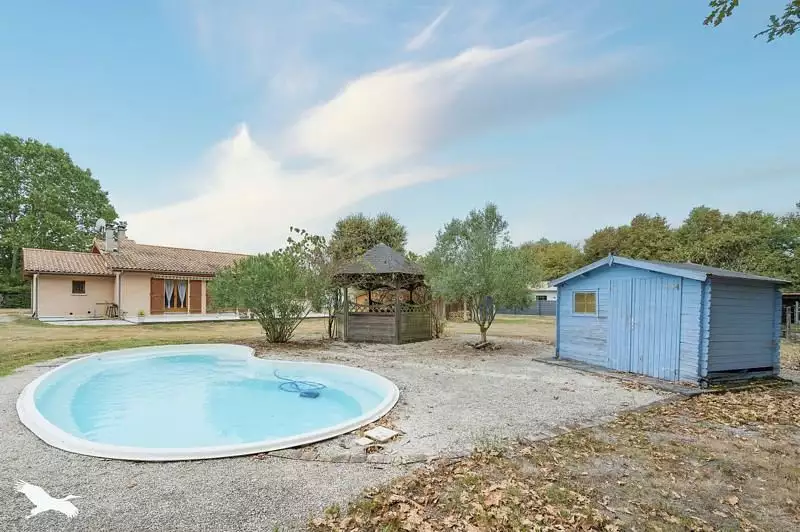 Située au calme et en lisière de forêt, dans un cadre verdoyant, à 5 mn du Barp, 8 mn du centre de Salles et 3 mn de l'école, maison traditionnelle d'environ 107 m2 comprenant entrée, séjour, cuisine équipée, 3 chambres, salle d'eau, wc séparé, cellier, garage attenant, pisine et 2 cabanons, sur une parcelle d'environ 14 000 m2