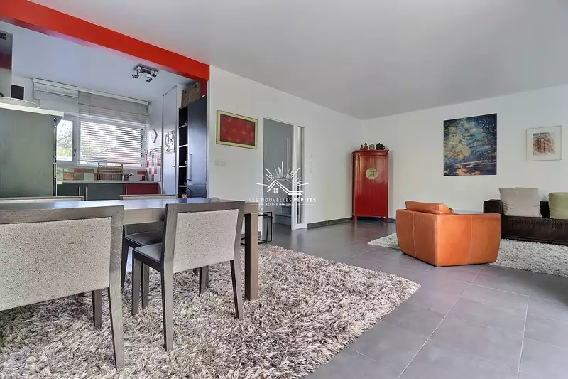 La maison se compose d'une entrée indépendante donnant accès au garage avec un espace buanderie, à un WC et à une belle pièce de vie avec sa cuisine ouverte et équipée.