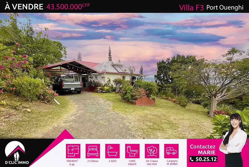 Idéalement située dans le lotissement très prisé de Port-Ouenghi plage, à deux pas de la marina, en position dominante avec superbe vue mer, l'agence D'CLIC IMMO vous propose une superbe villa en construction traditionnelle datant des années 2000 d'une surface habitable de 108.80m² + environ 180m² d'annexes + piscine hors sol, sur un beau terrain arboré de 34.17 ares.