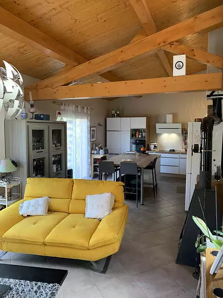 Une pièce à vivre de 37 m2 avec cuisine aménagée récente, poêle à bois neuf, accès à la terrasse , patio, deux baies vitrées donnant sur le jardin de 300m2.