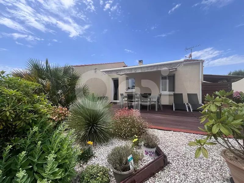 Maison de plain pied en parfait état comprenant : entrée avec placard, vaste séjour avec cheminée/insert, cuisine ouverte équipée, 3 chambres avec placards, salle d'eau, wc, cellier.