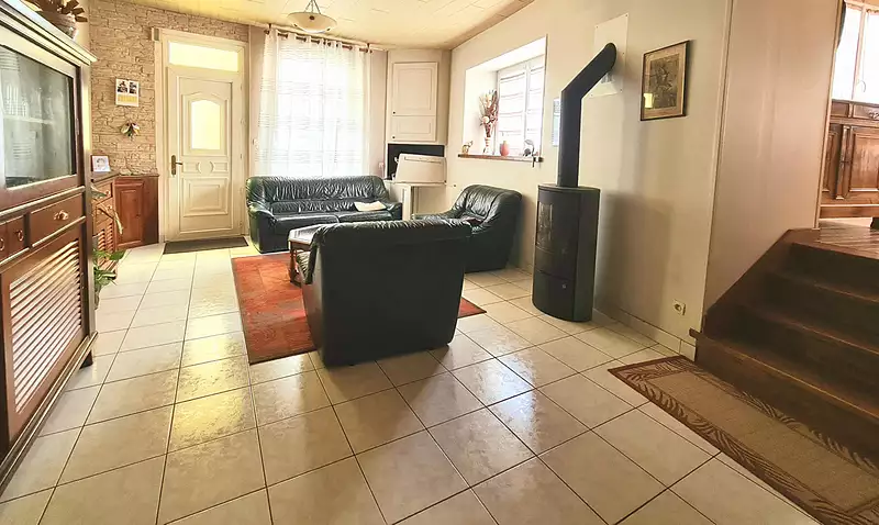 Une maison à usage d'habitation, comprenant : - au rez-de-chaussée : Un salon séjour avec poêle à bois, une cuisine donnant sur une petite cour, une salle à manger, une chambre avec point d'eau (douche et lavabo), WC. - au 1er étage : 2 chambres, un bureau, une salle de bains, un WC, une terrasse. - deux garages, cave. Le prix comprend les honoraires d'agence, 8 000 euros TTC à la charge de l'acquéreur, soit 3,90 % ttc du prix net vendeur. Prix hors honoraires d'agence : 205 000 net vendeur. Consommation énergie primaire : 269 kWh/m²/an Consommation énergie finale : Non communiqué Montant des dépenses annuelles d'énergie pour un usage standard : entre 1820 euros et 2510 euros par an, prix moyen des énergies indexé au 1er janvier 2021 (abonnement compris). CARTE PROFESSIONNELLE D'AGENT IMMOBILIER N°CPI44012020044045 IMMATRICULE AU RCS ANGERS. (3.90 % honoraires TTC à la charge de l'acquéreur.)