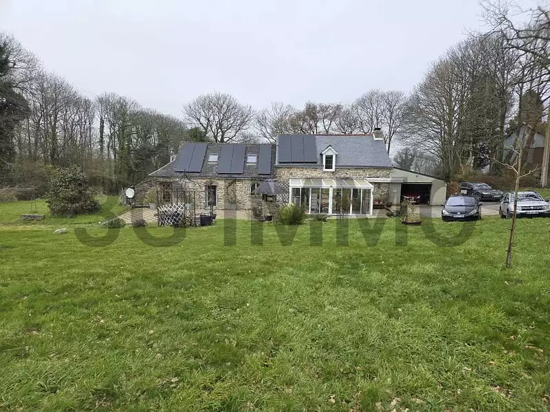 GOURIN : en campagne, sans vis-à-vis, longère en pierre de 1830 entièrement rénovée comprenant au RDC : pièce principale (cuisine aménagée et équipée / salon / salle à manger) avec poêle à bois, véranda, couloir/dégagement, chambre avec placard, salle de bains (avec baignoire balnéo + douche), WC## à l'étage : palier/couloir avec placard, pièce palière/bureau/chambre d'appoint, placard, 2 chambres, salle d'eau et WC. En dépendances : appentis/cuisine d'été (mitoyen à la maison) + garage 1 voiture.