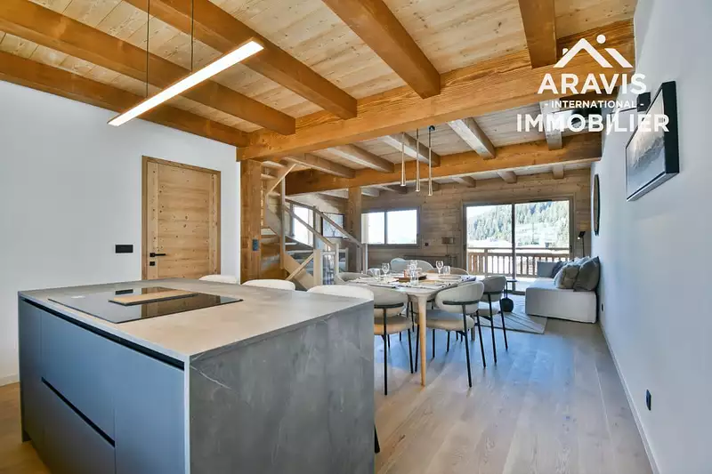 Demi-chalet dans un nouveau programme au col de la Croix-Fry harmonieusement intégrés au paysage et entourés de sapins verdoyants. D'une superficie de 109 m2 plus un garage. Le vaste séjour est agrémenté d'une cheminée, en prévision de longues soirées au coin du feu. Ce chalet profite d'une vue spectaculaire orientée vers les cimes de la Tournette. Toiture à deux pans, mariage de la pierre et du bois, l'architecture s'inspire des maisons traditionnelles de Manigod, constituées d'un volume simple en bois posé dans la pente sur un socle en pierres, et dont le pignon s'ouvre sur le grand paysage.