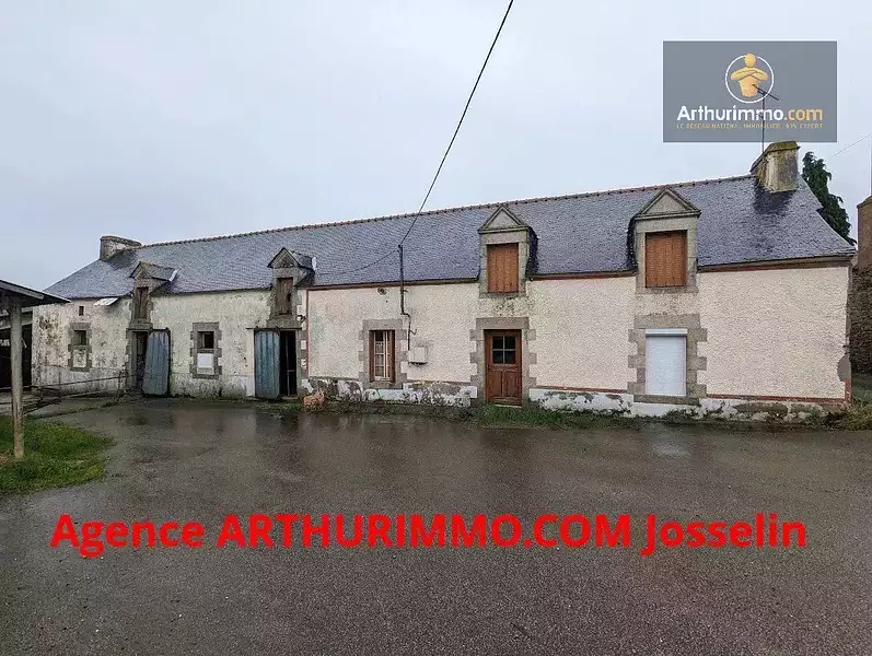 Maison/villa 5 pièces située à 8 mn de josselin avec une belle vue dégagée sur la campagne, longère à rénover en pierre recouverte en ardoise, non mitoyenne, comprenant un côté habitation au rdc cuisine avec cheminée, séjour avec cheminée, salle d'eau/wc. a l'étage un couloir desservant 3 chambres, coin d'eau sur le palier. dans la seconde partie accolée et communiquant à la maison, ancienne étable de 102 m2 avec grenier au-dessus de même superficie, 3caves. attenant à la maison, un très grand terrain agricole de 3,7 ha libre de toute location avec un hangar de 610m2, un de 120 m2 et un abri bois. la maison est raccordée à l'eau et l'électricité. fosse septique non conforme. ref 1465 -