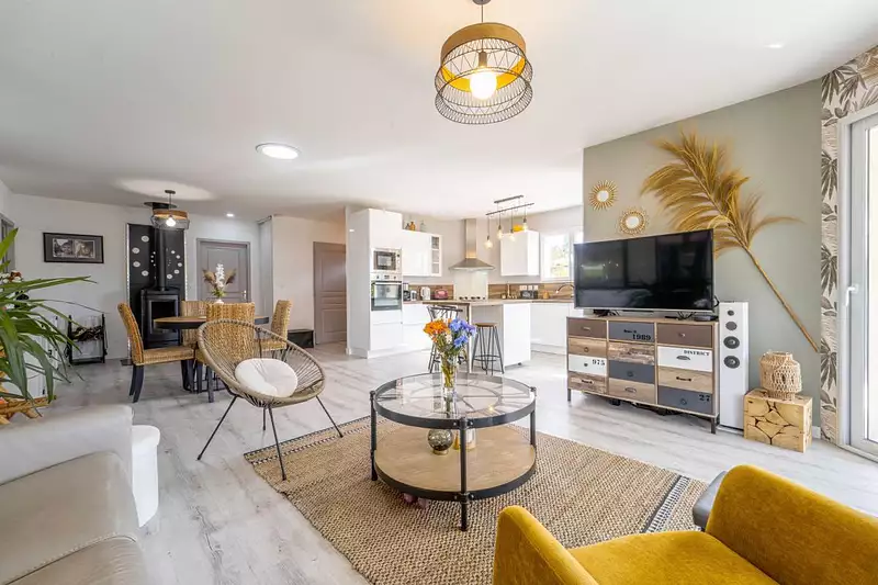 Vous serez séduit dès l'entrée par une pièce de vie spacieuse et lumineuse, composée d'un séjour convivial ouvert sur une cuisine moderne, aménagée et entièrement équipée.