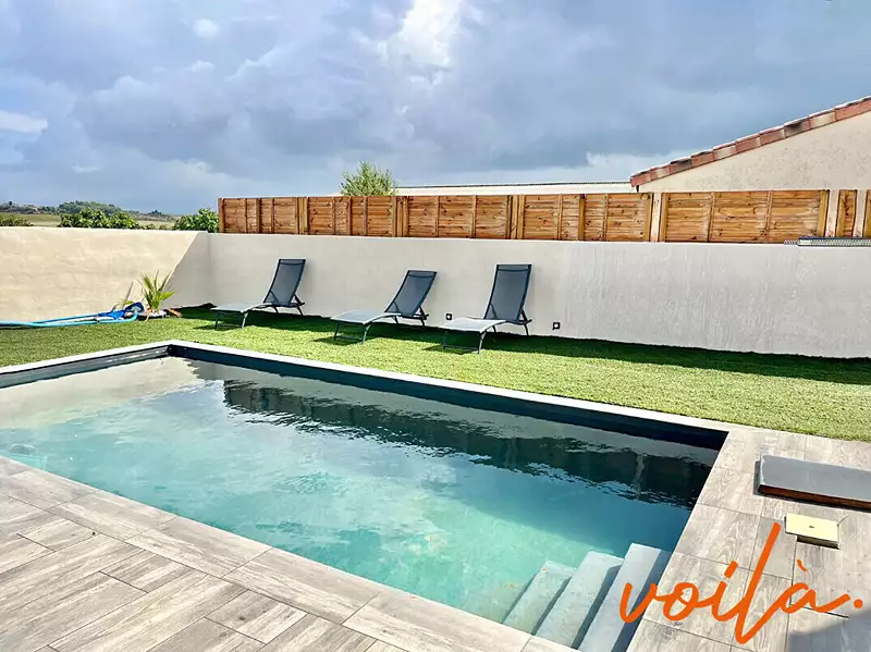 Réf. HIRST - PROCHE CARCASSONNE - Votre agence Voilà immobilier vous propose cette maison de 2024 à vendre sous garantie décennale de 110m² habitables environ comprenant 3 chambres dont 1 suite parentale avec dressing - salle d'eau - WC, 1 séjour / salle-à-manger de 40m², 1 cuisine américaine équipée, 1 salle de bains - douche - double vasque, 1 WC séparé et 1 garage motorisé. Le tout sur une parcelle de 430m² aménagée avec terrasse et piscine 6m x 3m (membrane armée, au sel) Les +++: Chauffage gainable "airzone" réversible, volets roulants électriques, double vitrage aluminium, sans vis-à-vis. CALME et VUE DEGAGEE. Les informations sur les risques auxquels ce bien est exposé sont disponibles sur le site Géorisques : www.georisques.gouv.fr Le prix indiqué comprend les honoraires de négociation, ces honoraires sont à la charge exclusive du vendeur. Camille Maurette, Directrice, immatriculé au RSAC de Carcassonne sous le numéro 90464305300021 - carte professionnelle n° CPI11012021000000008
