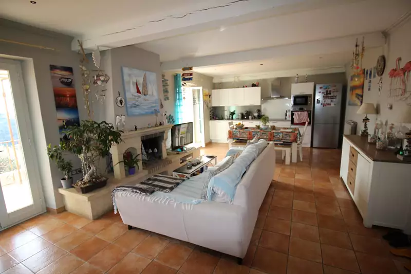 Sur les collines du proche arriere pays, dans le village de COLOMARS., Une maison de caractere d'environ 110 m2 sur deux niveaux comprenant au premier niveau : un tres bel espace a vivre compose d'un sejour avec cheminee, , s'ouvrant sur une terrasse, une cuisine ouverte equipee, une chambre, une salle d'eau, wc. A l'etage : trois chambres, un bains, nombreux rangements. L'ensemble est en bon etat., La maison beneficie d'un ensoleillement total et d'une vue tres degagee sur la campagne environnante. Un garage et un grande cave complete le tout.