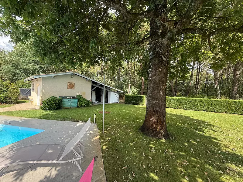 Exclusivité Quartier réjouit joli plain pied avec grand terrain clos de 1120 m2 avec un puit. Elle se compose d'une grande pièce de vie avec insert et cuisine ouverte équipée, un cellier, salle d'eau, wc séparée et trois chambres. Une grande terrasse couverte avec un coin cuisine d'été et vestiaire pour la piscine. Piscine au sel avec nage à contre courant. Garage indépendant. (3.00 % honoraires TTC à la charge de l'acquéreur.)