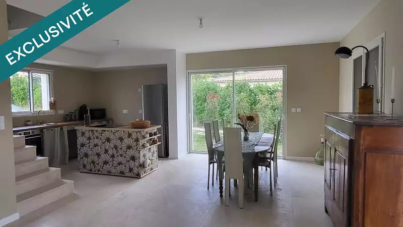 Édifiée sur une parcelle de 550 m² piscinable, elle offre en rez-de-chaussée une vaste pièce de vie baignée de lumière grâce à ses nombreuses ouvertures, prolongée par une cuisine moderne et fonctionnelle avec îlot central et cellier attenant. Un toilette indépendant complète ce niveau.