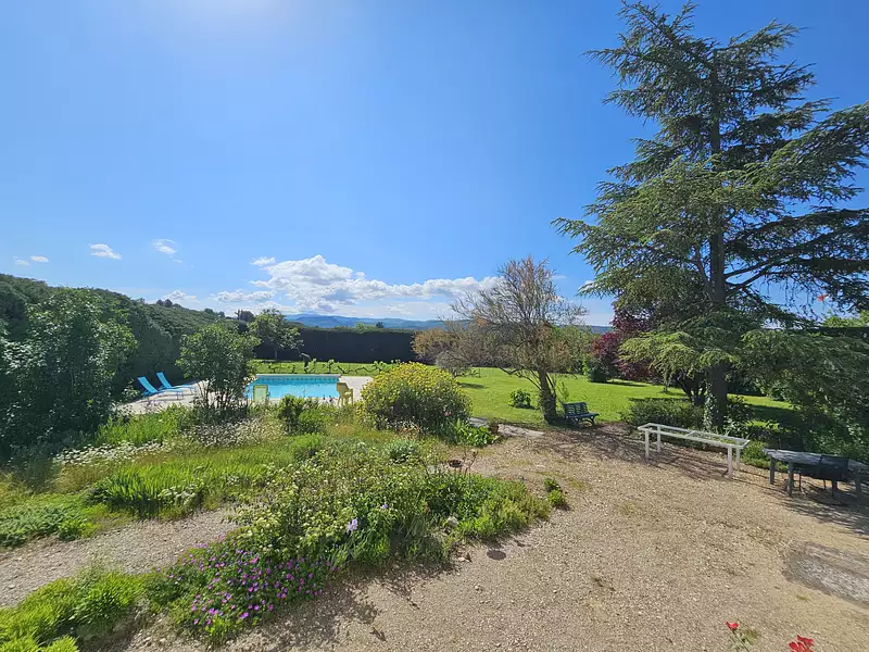 L’espace piscine, à l’abri des regards, bénéficie d’une belle vue dégagée sur le Luberon et d’un parc arboré de plus de 2 600 m2.