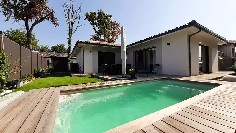 Découvrez cette superbe maison neuve de 2023, située à Gujan-Mestras, à proximité du Bassin d'Arcachon. Elle offre un cadre de vie idéal grâce à sa piscine chauffée, sa terrasse en bois et son environnement calme et boisé. Composée de trois chambres, dont une suite parentale avec salle d'eau et dressing, d'un salon-séjour lumineux, d'une cuisine aménagée et équipée, d'un cellier et d'une salle de bains, elle est prête à vous accueillir.