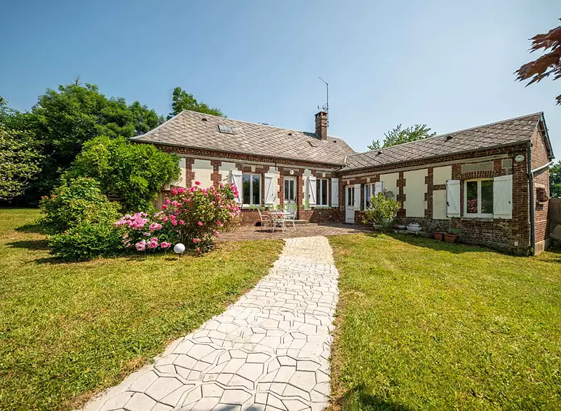 27150 Hébécourt (Gisors) MonEden vous présente cette PROPRIETE de 1310m² comprenant une charmante Longère R+1 élevée sur cave et rénovée tel un loft tout en préservant son charme authentique. Dès le portail vous serez immédiatement séduit par le charme de ce grand terrain clos, plat et arboré (magnifique tilleul, grand merisier, arbres fruitiers). La maison exposée plein Sud propose une pièce de vie de 50m² traversante ouverte très lumineuse dotée d'une cheminée en insert prolongée de la cuisine (dans l'aile EST) dont la hauteur cathédrale donne une agréable sensation d'espace. La réception est complétée d'une salle d'eau avec toilettes et d'une buanderie. A l'étage deux chambres illuminées par les vélux pourvues de poutres apparentes et agrémentées d'une jolie salle de bain + wc. Des travaux d'isolation des murs intérieurs ont été réalisés ainsi que l'installation d'une pompe à chaleur réversible. La maison est en parfait état et permet un aménagement immédiat ! MAISON coup de coeur parfaite en résidence secondaire entre Paris (1h15) et Rouen, terrain adjacent constructible en sus du prix pour faire profiter famille ou ami! (3.58 % honoraires TTC à la charge de l'acquéreur.)