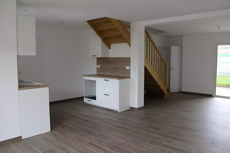 A La Guerche-De-Bretagne, cette maison neuve, située à 10 minutes à pieds du centre-ville, se compose en rez-de-chaussée d' une cuisine aménagée ouverte sur le séjour, une chambre avec salle d' eau privative, une buanderie, un WC, un garage. A l' étage le palier dessert 3 chambres avc placards, une salle de bains et un WC. La maison dispose d' un jardin clos avec un espace terrasse. (3.73 % honoraires TTC à la charge de l'acquéreur.)