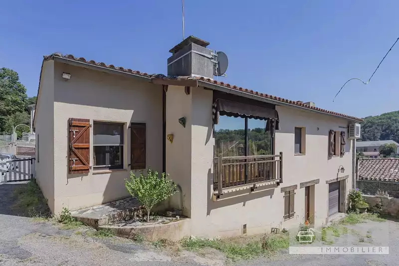Sur le côté de la maison, se trouve l’entrée principale. En entrant, on arrive dans un hall de 7m² qui mène à la cuisine de 9m². La cuisine est ouverte sur le séjour, et dispose d’un four encastré, évier et un avec bar. Le séjour/salle à manger est spacieux et lumineux grâce à ses deux grandes baies vitrées avec stores électriques, et offre de belles vues sur le village de Laguépie.