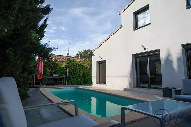 L'agence efka Port Marianne vous propose en exclusivité cette charmante villa de 110 m2 sur 2 niveaux. Vous disposez d'une jolie parcelle de terrain de 371 m2 avec piscine. La maison comprend, 4 chambres dont une suite parentale au rez de chaussée, un vaste séjour sale à manger, cuisine de 43 m2 très lumineux, 2 salle d'eau, douche à l'italienne, 1 buanderie. Tout le confort d'une maison actuelle, pompe à chaleur, volets électriques etc... A l'extérieur, une jolie piscine, un espace permettant de stationner 3 voitures. Vous êtes tout proche du CV, à moins de 10 mn à pieds du tranway, 10 mn de la gare et proche des plages. Contact Karim Bouakira 0601887739 agent commercial indépendant RCAS 913753265.