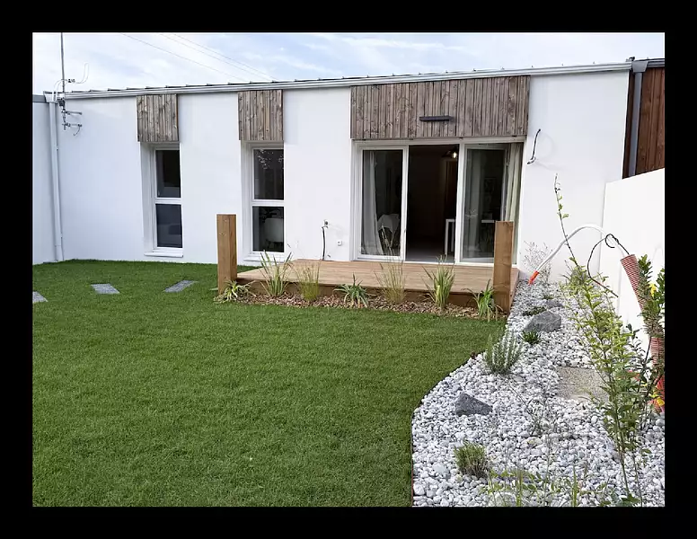 BEL ENVIRONNEMENT - AU CALME - MAISON NEUVE PLAIN PIED 110 M2 T4 3 CHAMBRES + TERRASSE SUR JARDIN + 2 PLACES DE PARKING. DISPONIBILITE 2T 2026., Situe sur la commune de Perigny, proche du canal de Rompsay a 5 min de La Rochelle dans la CDA, ce bien d'une surface de 110 M2 comporte une entree, un sejour/cuisine de 47,9 M2, 3 chambres de tres belle dimension, deux salles d'eau, deux wc, une buanderie., Exposition au sud avec une vue degagee arboree., Terrasse plein sud de 11 M2., Prestations : carrelage et l'installation de chauffage individuel est assure par une pompe a chaleur (le chauffage du sejour, des chambres et de la cuisine est assure par des appareils des radiateurs)., Jardin cloture de 112 M2. , 2 Place de parking et local privatif pour les velos., En facade, des bardages verticaux de bois clair alternent avec des enduits blancs epures. Les couvertures metalliques parachevent avec modernite cet elegant ensemble residentiel. Pour preserver un style de vie serein, la disposition...