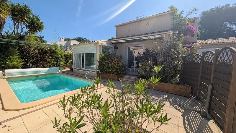Très belle maison d'une superficie de 110 m², rénovée état impeccable, avec piscine, terrasses, garage, 1 petit chalet , stores électriques, climatisation , alarme et stores banes.