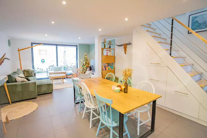 Une entrée nous permet de nous déchausser et poser nos manteaux. De suite à gauche le premier WC. Nous entrons ensuite dans la grande pièce de vie entièrement carrelée et qui propose une surface de 43m2 environ. La lumière est traversante et le salon est naturellement orienté vers la terrasse. La cuisine est équipée et les éléments encastrés resteront. En y regardant de plus près, de nombreux rangements ont été créés afin d’optimiser les volumes (placards sous l’escalier, près de la cuisine…). L’ensemble est très harmonieux et on s’y sent franchement bien.