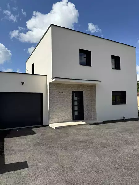 VOUJEAUCOURT. Magnifique pavillon (construction de 2024) mitoyen par le garage, d'une surface de 110 m2 sur 2 niveaux, elle se compose : Grand hall d'entrée avec placard - très belle pièce de vie d'une surface de 36 m2 donnant accès sur terrasse de 16 m2 - coin cuisine non équipé - wc indépendan avec lave-mains - garage 1 voiture avec porte motorisée et buanderie-chaufferie - étage : dégagement - 3 chambres avec placards - salle de bains avec baignoire + douche et wc. Parking privatif. Sous-sol. Chauffage au sol sur les 2 étages par pompe à chaleur - climatisation réversible - volets électriques. Notre avis : Maison spacieuse et lumineuse avec de très belles prestations - bien située environnement verdoyant proche commodités. Renseignements en agence !!