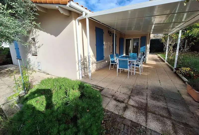 Cette maison de plain-pied se compose d'un double salon avec insert bois, ouvert sur une cuisine semi-ouverte. L'ensemble offre un accès direct à une terrasse couverte sous pergola, donnant elle-même sur un jardin de 400 m².