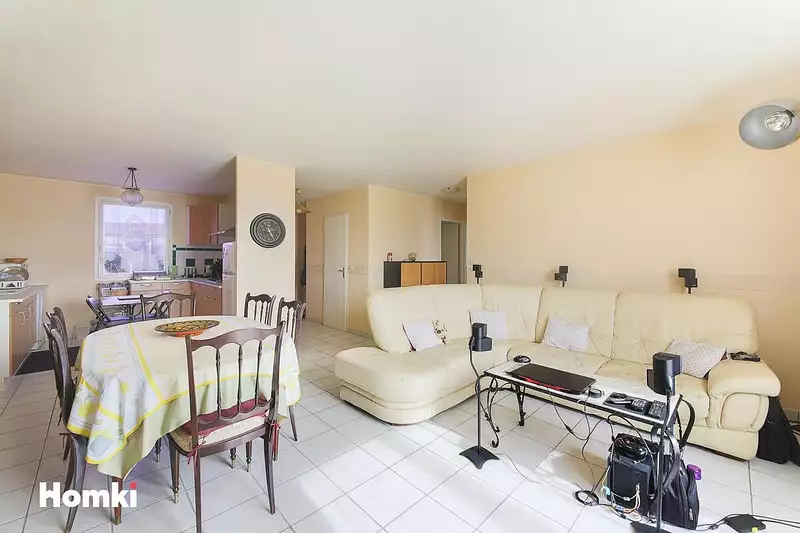 Séjour lumineux : Pièce de vie agréable avec cuisine américaine équipée, ouvrant sur la terrasse et la piscine.