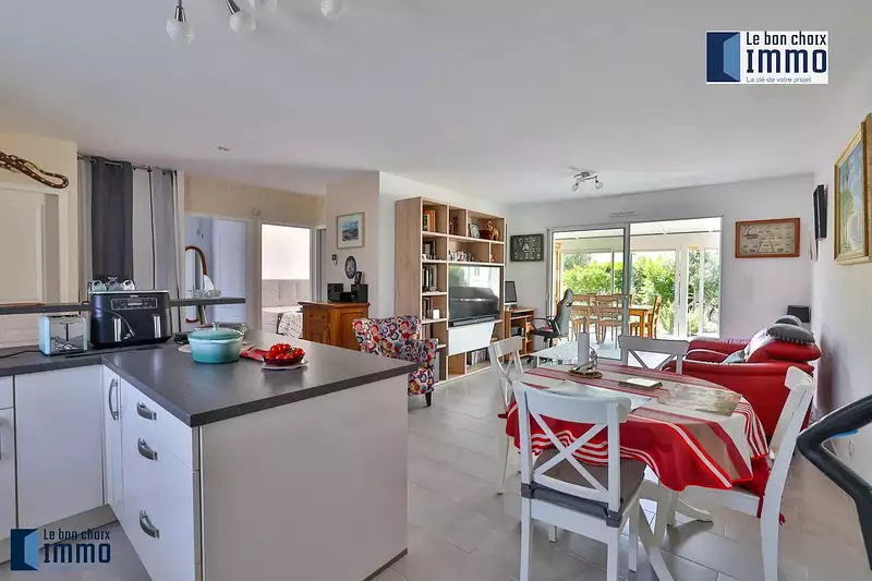 Une Entrée, Une Cuisine aménagée et Equipée ouverte sur une grande Salle à manger.