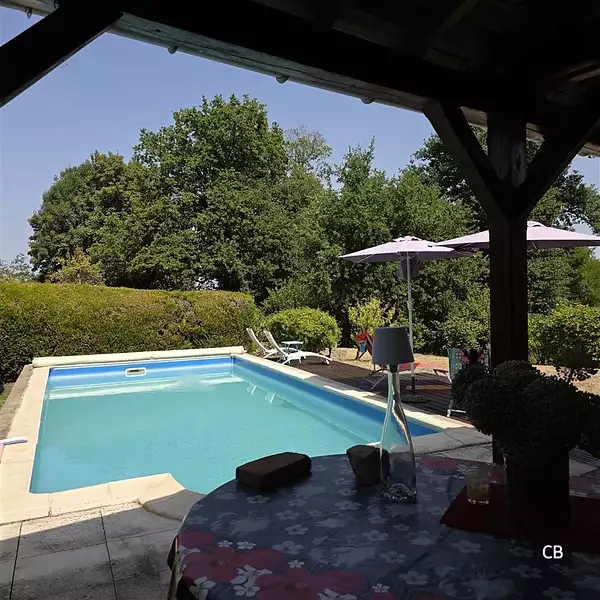 Cette maison de hameau indépendante avec grande piscine et jardin est proposée à la vente dans un petit hameau aux abords de Vaulry, en Haute-Vienne (87).