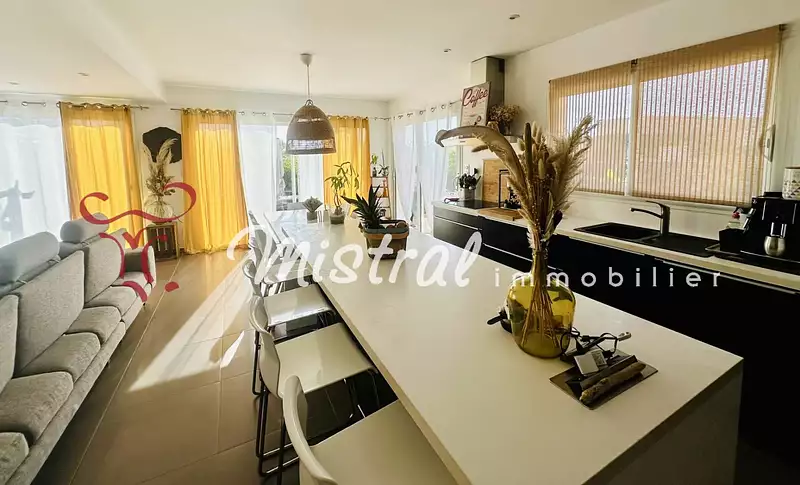 Nous vous proposons de découvrir cette récente villa contemporaine située dans un quartier résidentiel. Au rez-de-chaussée une agréable pièce de vie baignée de lumière avec cuisine ouverte entièrement aménagée et équipée. Un garage de 20m2 avec portail électrique. A l'étage 3 chambres avec placards, une spacieuse salle de bains avec baignoire et douche à l'italienne. Côté extérieur vous profiterez d'une piscine et sa terrasse en bois. Prestations de qualité. Chauffage pompe à chaleur, adoucisseur d'eau. La villa est entièrement climatisée. Aucun travaux à prévoir, coup de coeur assuré !